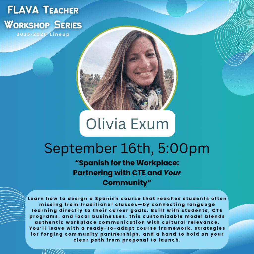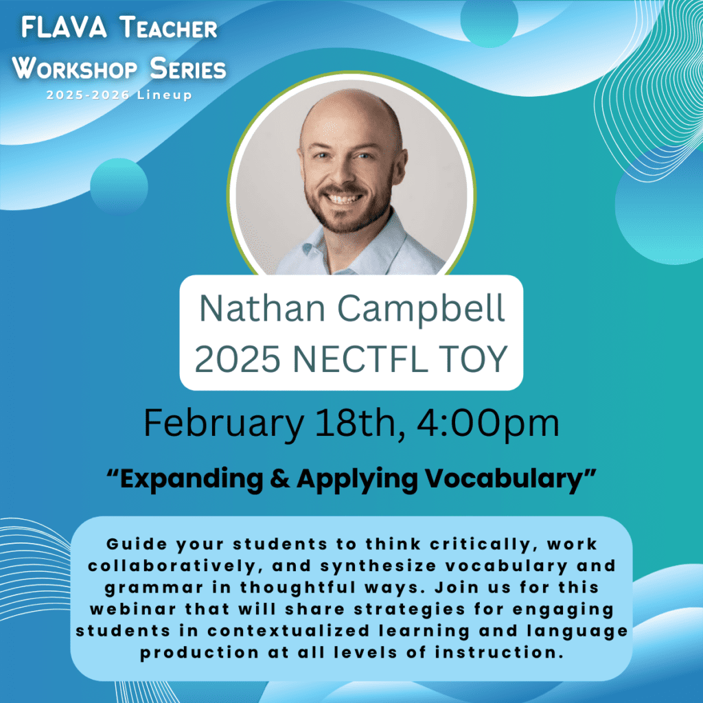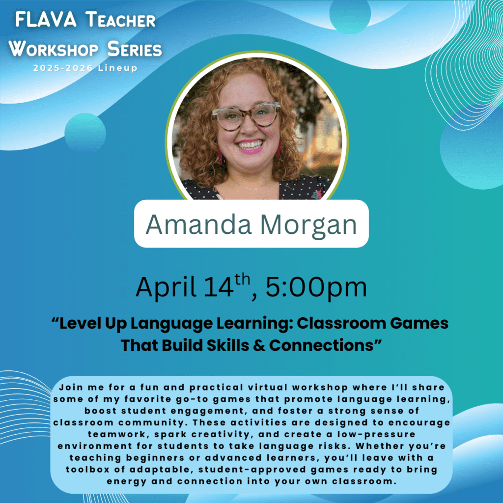 Each year, FLAVA invites World Language educators to share their expertise through FLAVA’s interactive Workshop Series. The one-hour sessions are broadcast via Zoom and are free and open to FLAVA members and members of our sister state organizations in NECTFL and SCOLT. The registration process is simple; each workshop has its own registration link located on Workshops School Year 2025-2026