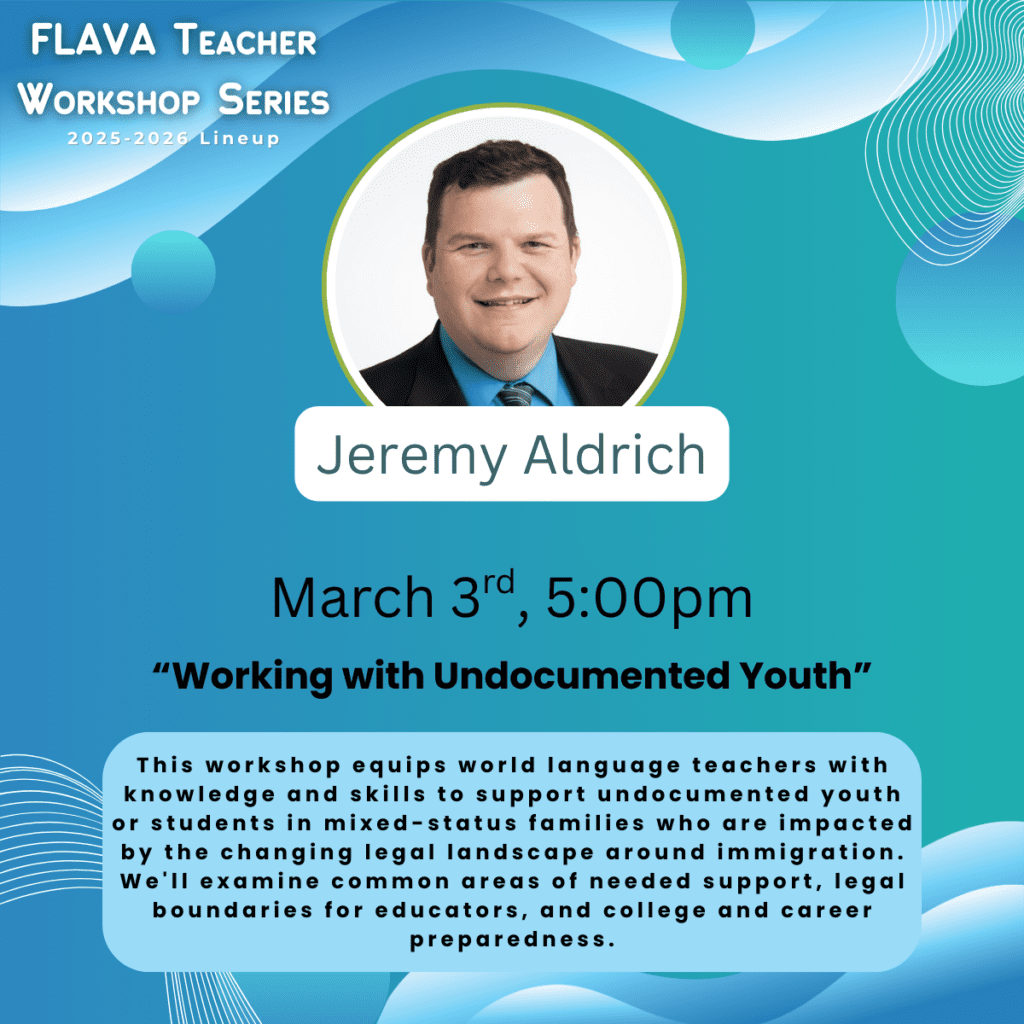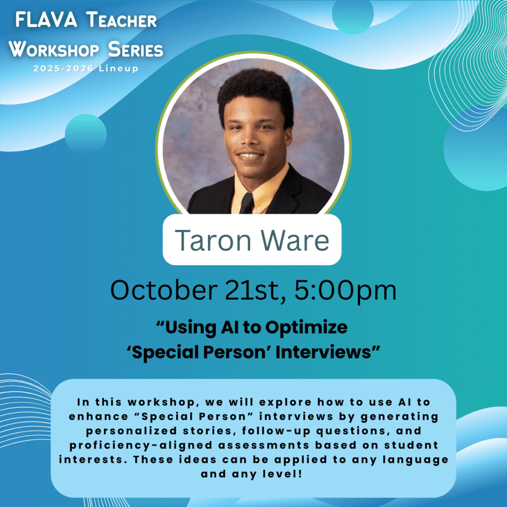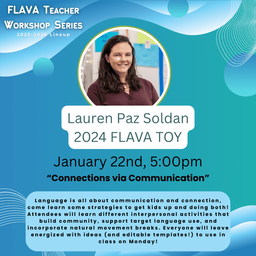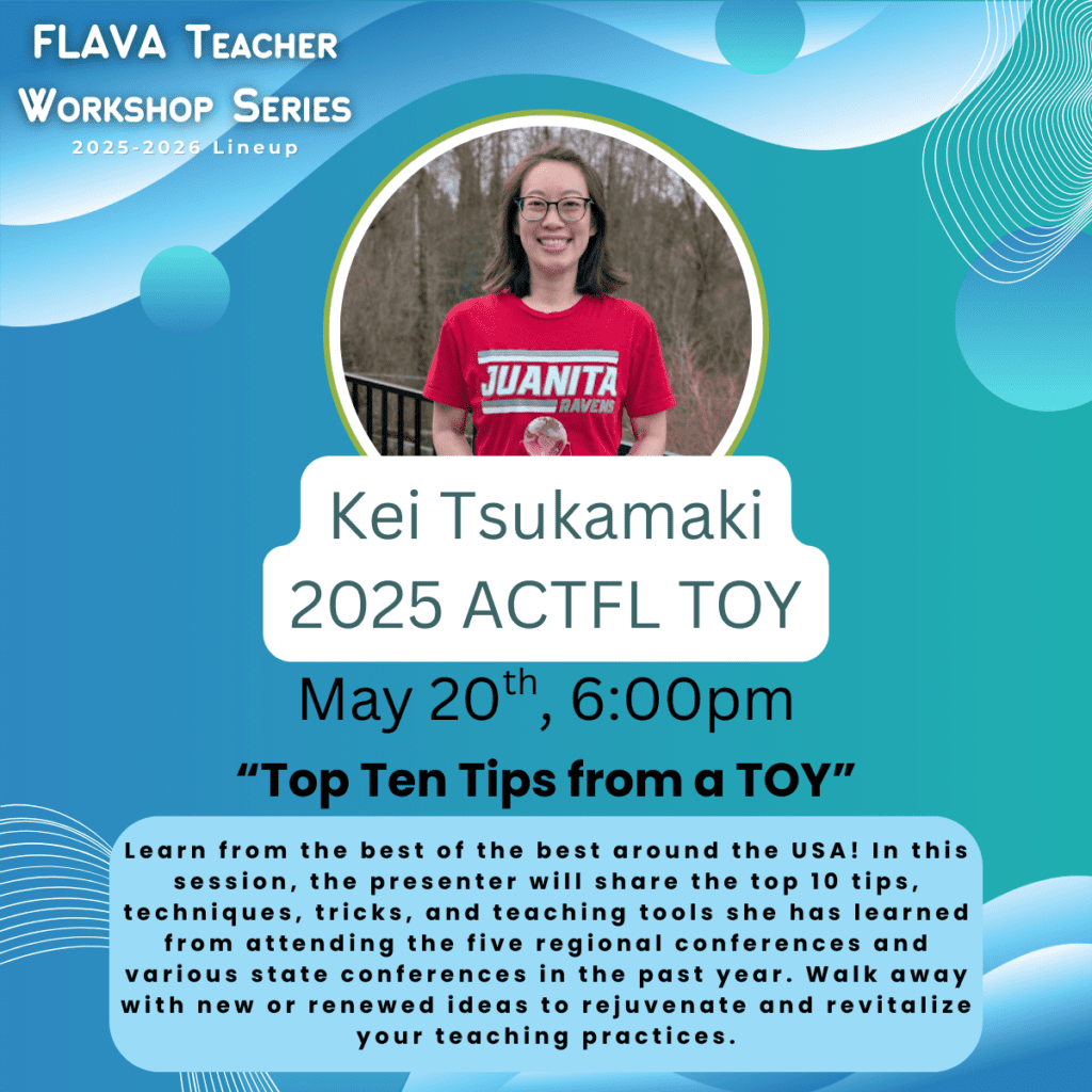 Each year, FLAVA invites World Language educators to share their expertise through FLAVA’s interactive Workshop Series. The one-hour sessions are broadcast via Zoom and are free and open to FLAVA members and members of our sister state organizations in NECTFL and SCOLT. The registration process is simple; each workshop has its own registration link located on Workshops School Year 2025-2026